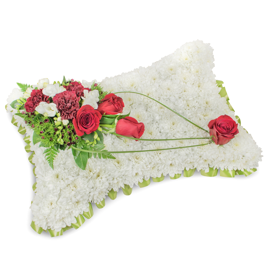 Express your deepest condolences with our stunning sympathy bouquet, meticulously crafted to convey love and remembrance. This unique arrangement features a harmonious blend of white chrysanthemums, red roses, white freesias, dark red carnations, dianthus, and bear grass, creating a visually captivating display.