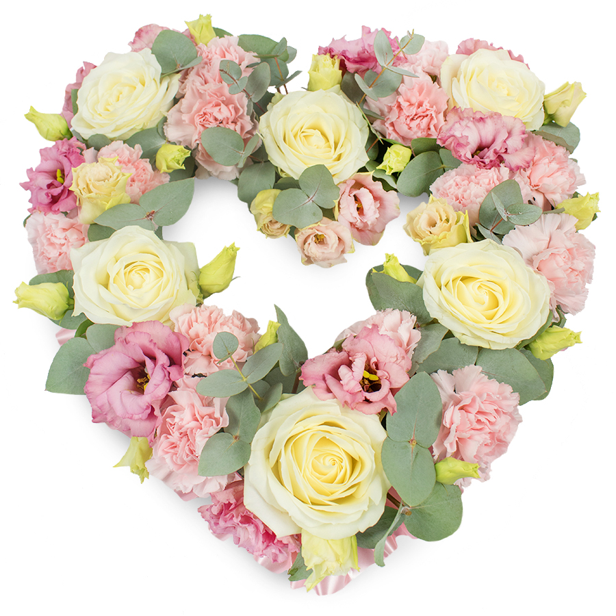 Express your deepest sentiments with our graceful open heart tribute bouquet. This elegant arrangement combines the purity of white roses, the sweetness of pink carnations, the sophisticated beauty of pink lisianthus, and the refreshing touch of eucalyptus leaves.